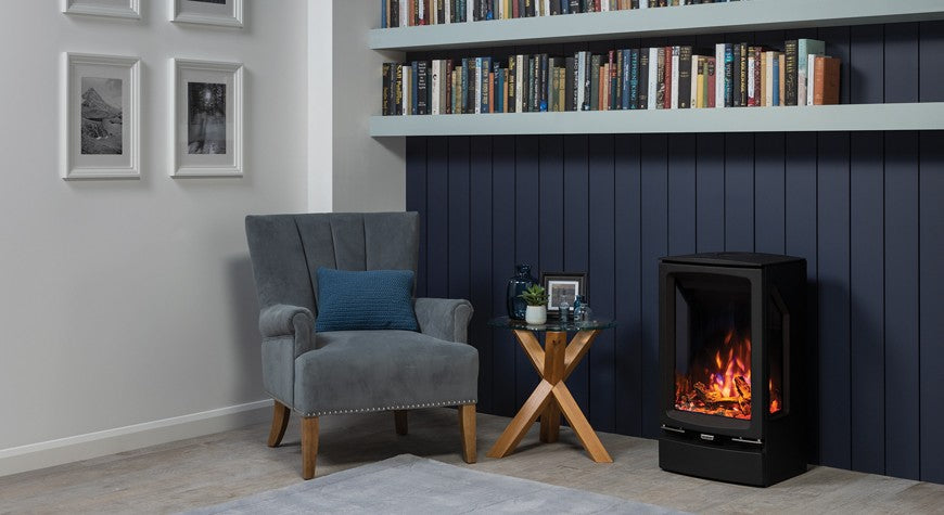 The stylishly contemporary Vogue Midi T electric stove range presents a collection of stunning options that will each create an eye-catching centrepiece with their captivating, 3D flame visuals. Providing 180° views of the flame effect, two windows on either side of the stove’s body supplement the large front window for a mesmerising display – visible from almost any angle in the room.